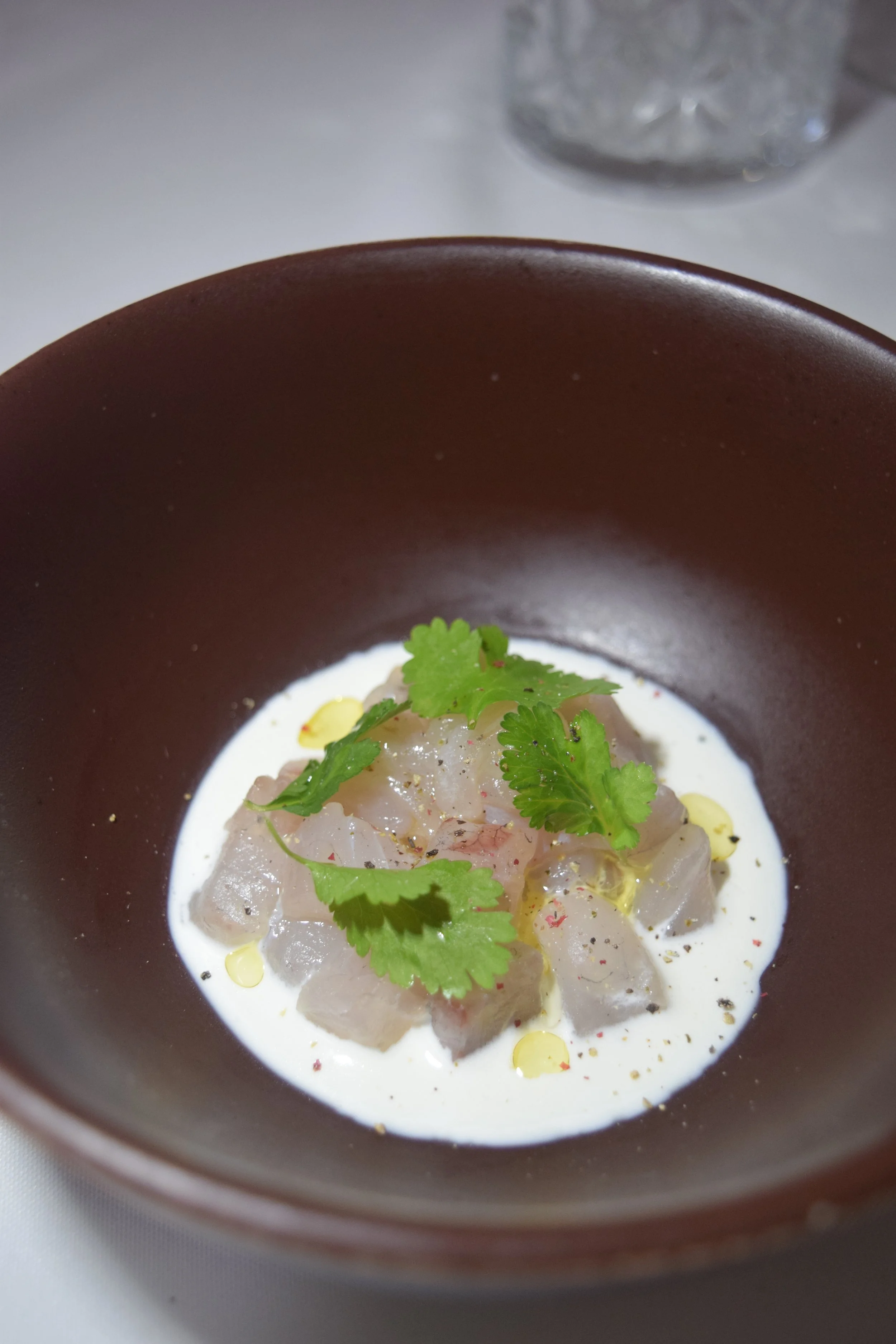 La viera es un molusco que tiene su propia casa en las conchas que la envuelven. La vieira como símbolo de mudanza. Como una pequeña casa que se abre, que invita a habitarla. Por eso el plato es un ceviche de vieira con una mermelada de melón dulce, por la ilusión de empezar esta etapa y una leche de tigre de maracuyá ácida, por el miedo que nos da tomar esta decisión.